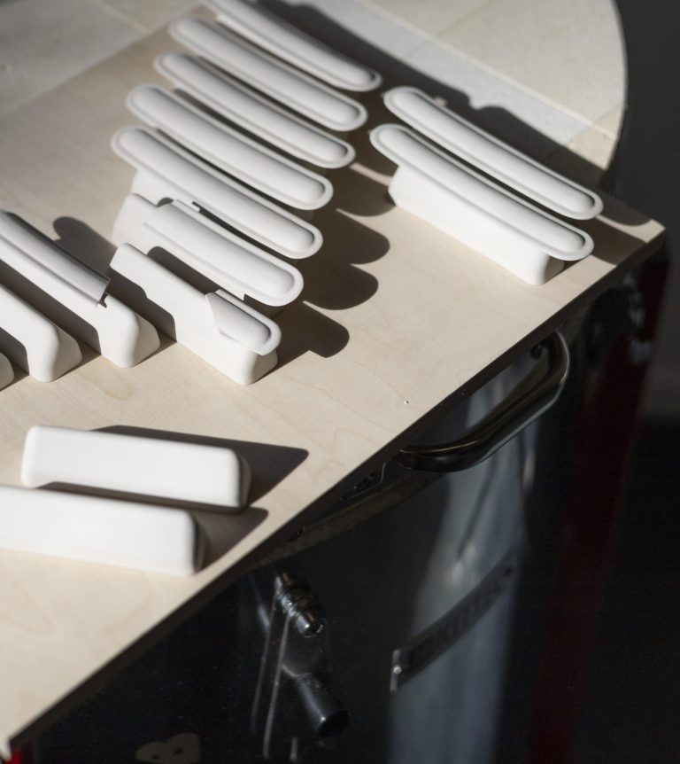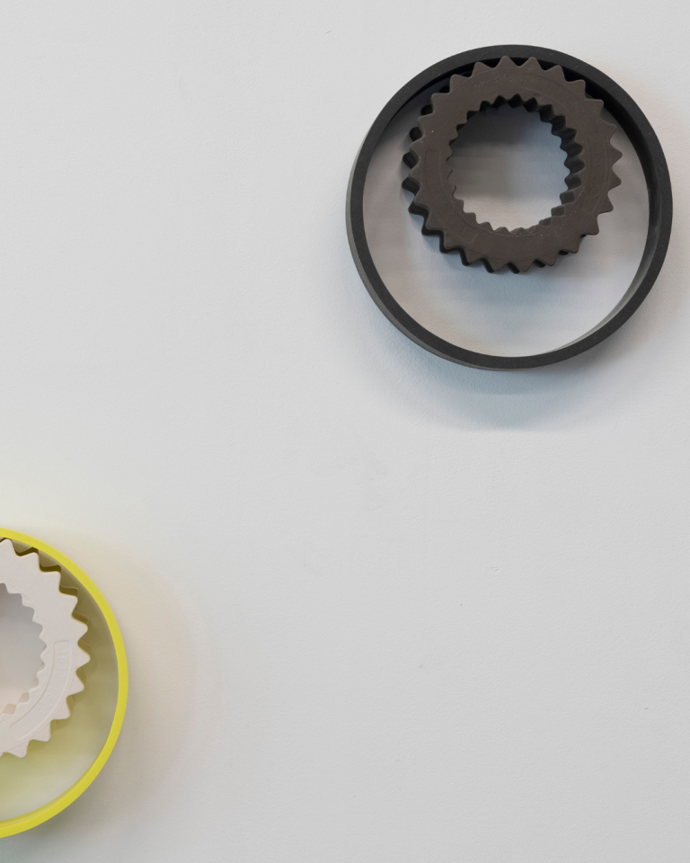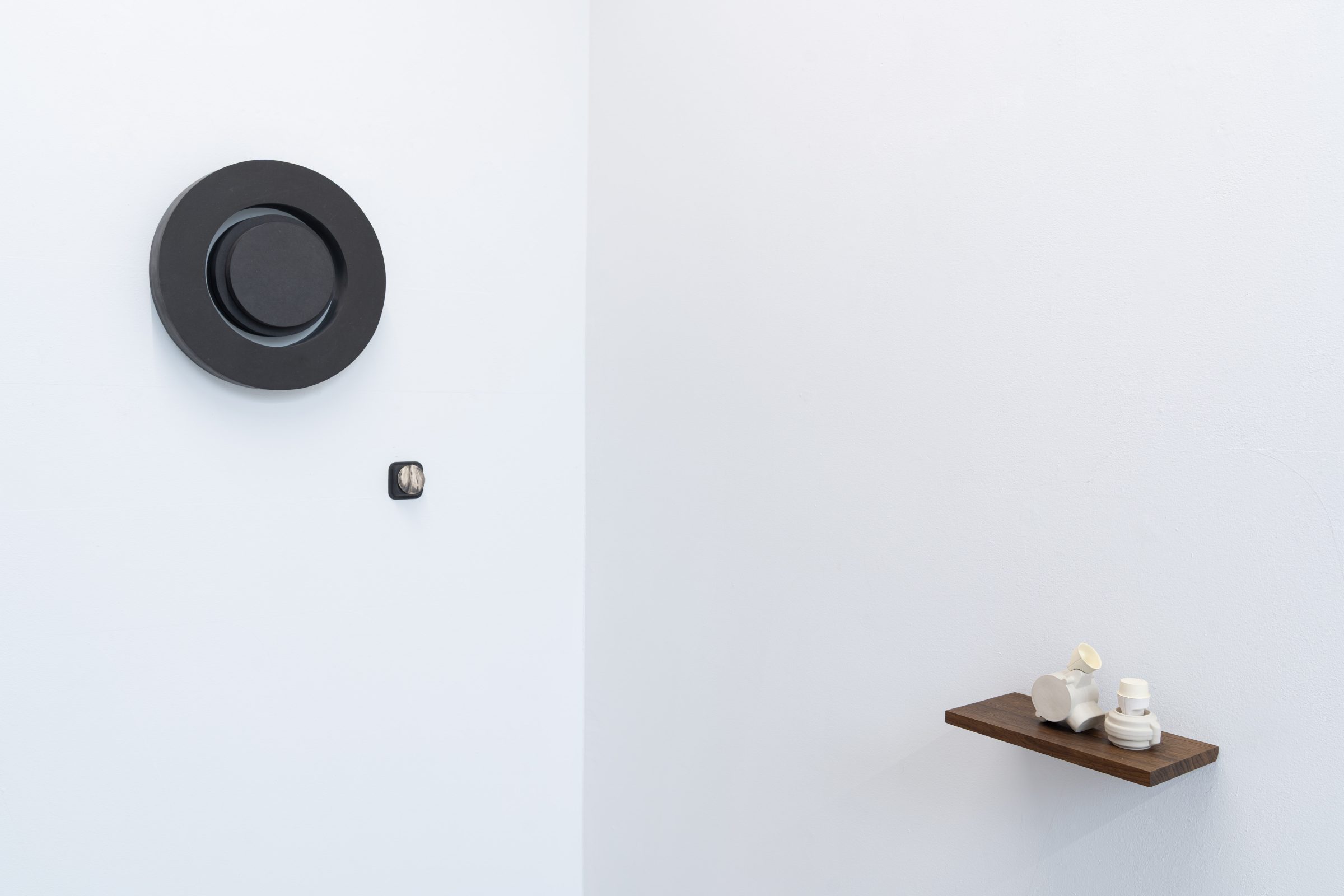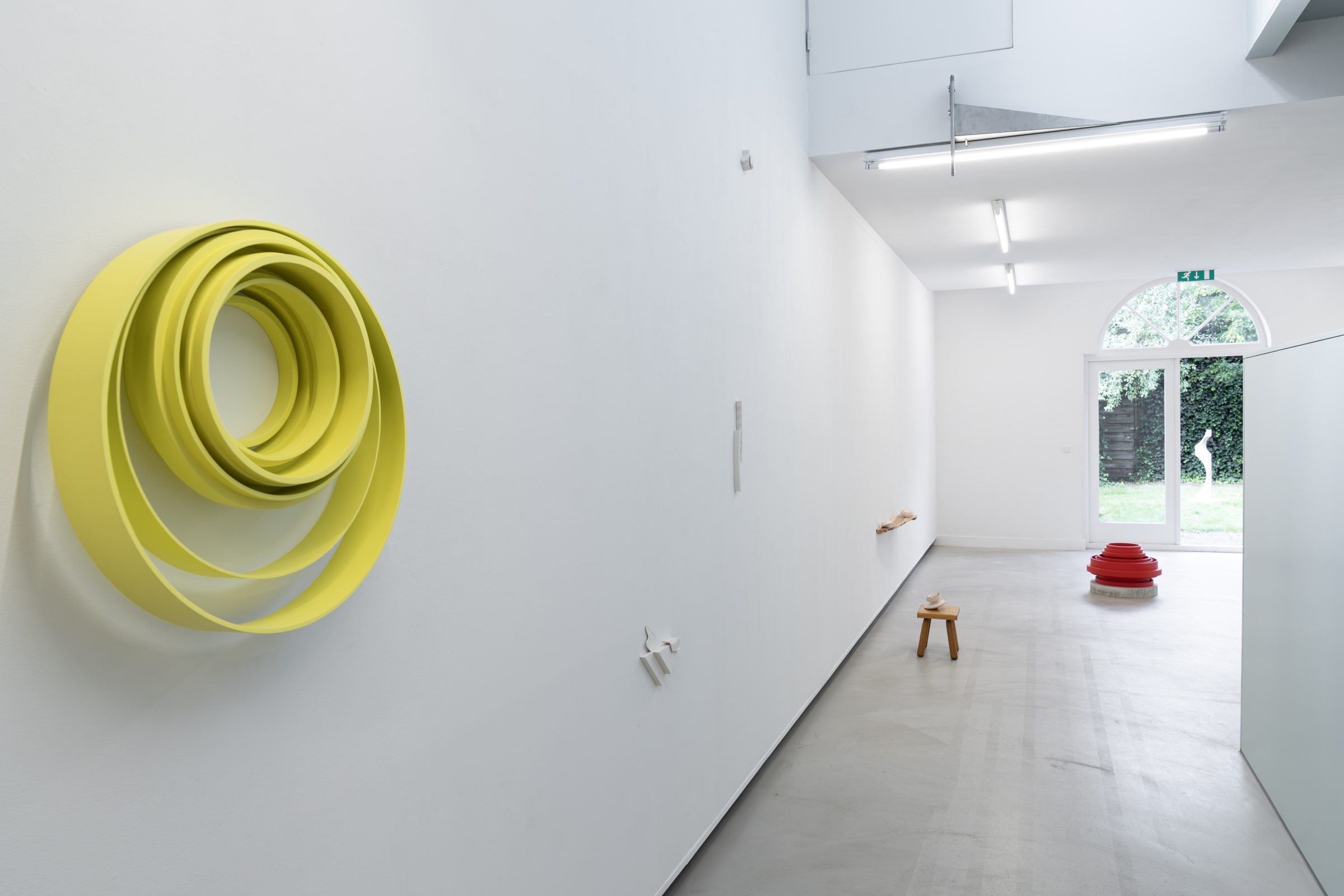 The installations seem to be difficult or intellectual, however are best discovered not by analytical contemplation, but by walking around them, seeing them from all angles and experiencing them as they are and as you are in space. Precision is key, precision can sometimes be arrived at intuitively. Imperfections that show up while working can be deleted, but likewise exaggerated to become formal elements. The position of the sculptures within the installation keeps the viewer in suspension, caught in the moment of decision or indecision. One millimeter to the left or a millimeter to the right suddenly means everything.