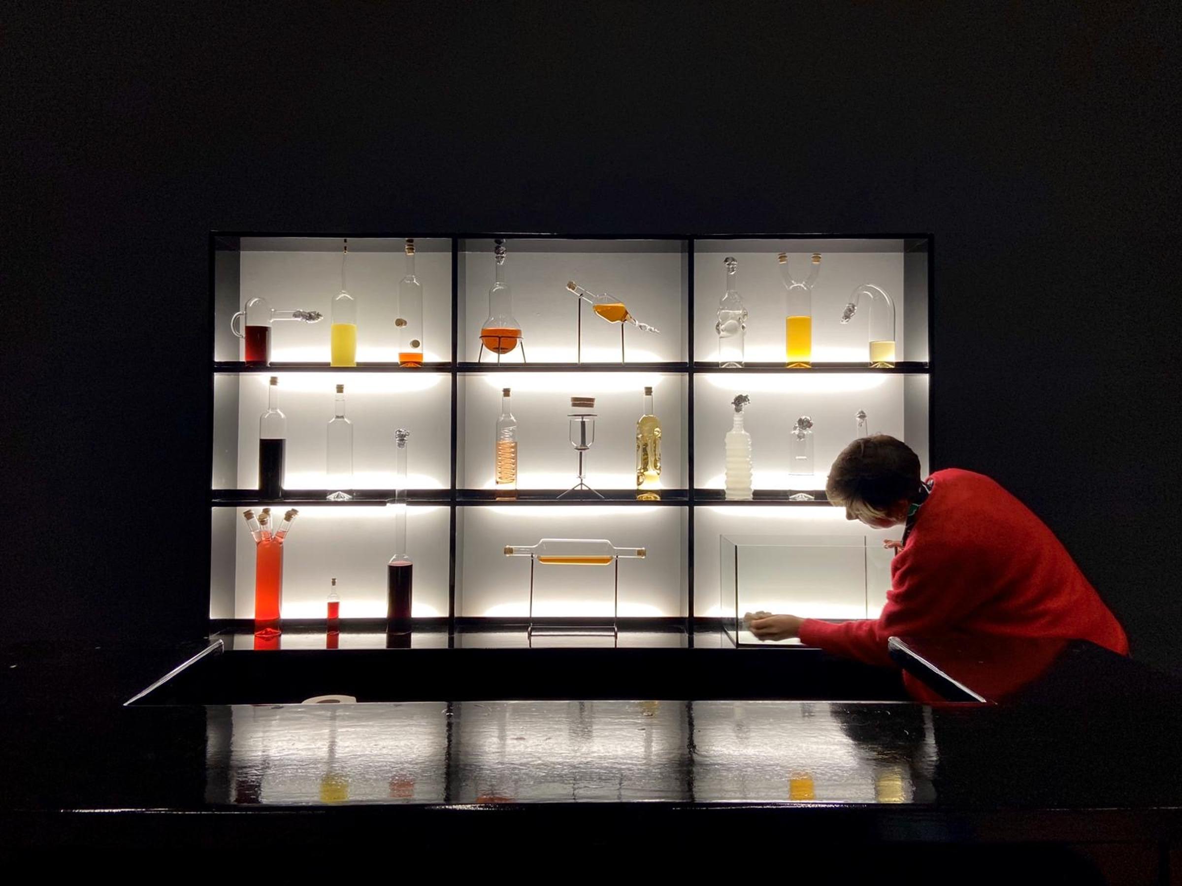 2020. Black lacquered bar, 20 handblown bottles, liquor. 210.0 x 290.0 x 220.0 cm