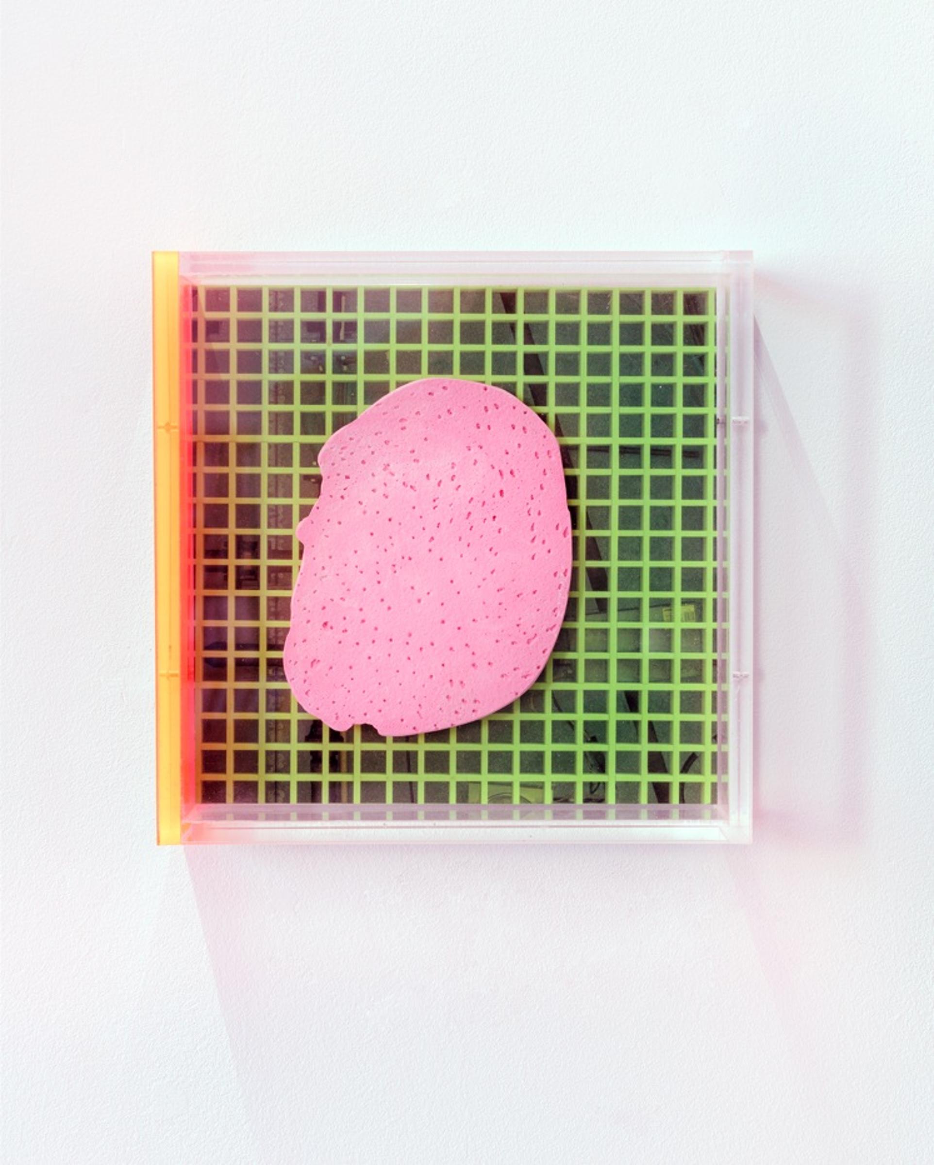2023. Ultrachromeprint, plaster, false ceiling, and wood in plexiglass container. 20.0 x 20.0 x 6.0 cm